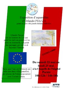 L’association de Jumelage, en collaboration avec la Ville de Pornic, organise une exposition d’aquarelles d’Orlando Piazza, peintre de notre ville jumelle italienne Omegna et d’œuvres des artistes pornicais Brigitte Darras, Anne Dumesnil, Fabienne Alliou-Lucas, Pierrick Tual.